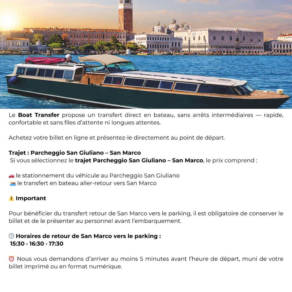 « Service pratique et bien organisé. J’ai réservé le transfert de Tronchetto à San Marco en quelques clics. Recommandé pour ceux qui veulent éviter la confusion et profiter pleinement du trajet. »